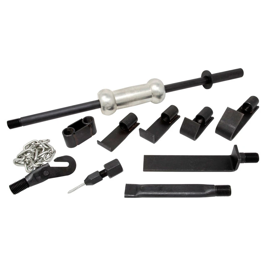 The AES “Big Brute” Dent Puller Kit, 10 LB helps in quickly assembling applied hook-ups on bumper ends, fenders, rocker panels, hoods and hood hinges, aligning doors and door edges, trunk and trunk hinges, and headlights.