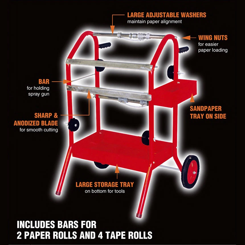 The Astro 18″ Masking Machine provides a convenient, portable work and storage unit for tape and masking paper. The machine makes it easy to mask vehicles and equipment before painting and other treatments. It features bars that can accommodate two 18″ paper rolls and four tape rolls. This masking machine is the perfect aid to repair jobs in any auto body shop. Boasting a sturdy steel construction, this masking machine offers a durable performance. Use the sharp, anodized blade to rip off paper smoothly.