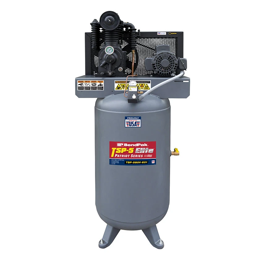 The BendPak Elite™ Air Compressor, 5 HP, 80-Gallon Vertical Tank, 60 Hz, 1-Phase – TS-580V-601 delivers proven longevity in the most demanding conditions. This unit runs at a slower RPM than most comparable units and they’re quieter, run cooler and cost less to operate. They are built with 100% cast-iron pumps that provide the quality and performance needed for heavy-duty applications.