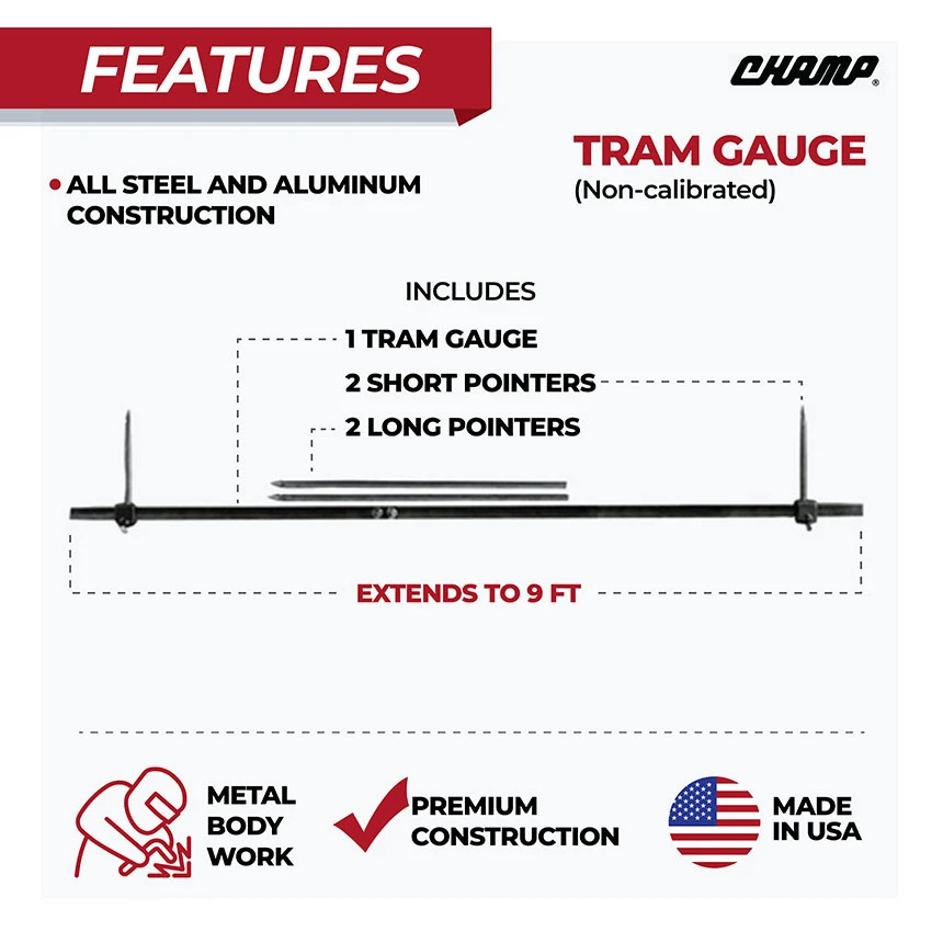 The Champ Tram Gauge is an all steel and aluminum construction gauge that can extend to 9 feet. It comes with two long pointers and two short pointers, and you can use a tape measure to set the measurements. To assemble or reassemble the tram gauge, insert the inner tram into the outer tram aligning the inner tram’s thumb screw in the slot on the rear side of the outer tram.
