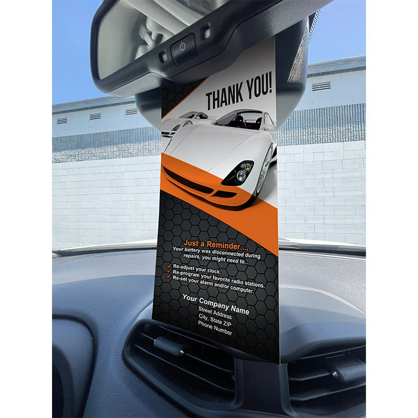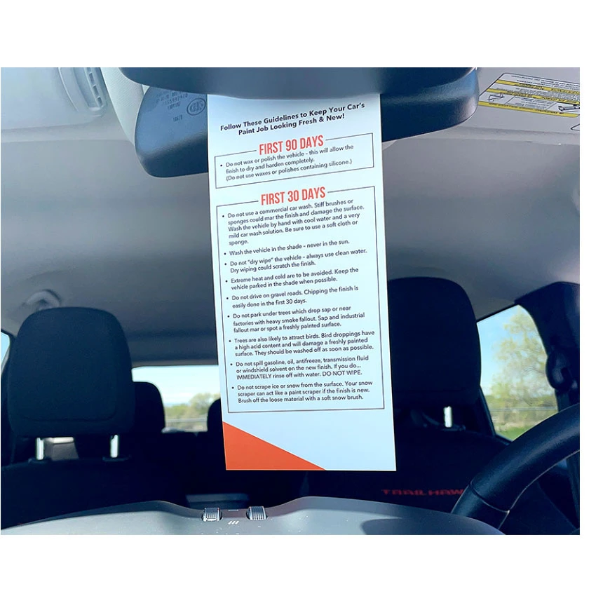 2-Sided Hang Tag with the front side providing a Thank You, a reminder for resetting pre-set items, and personalization with the company name. The back side explains how to take care of fresh paint after the car is delivered, from washing and parking tips to sun protection and rock chips. This simple instructional hang tags will provide confidence to your customer by helping them care for their beautiful new paint.